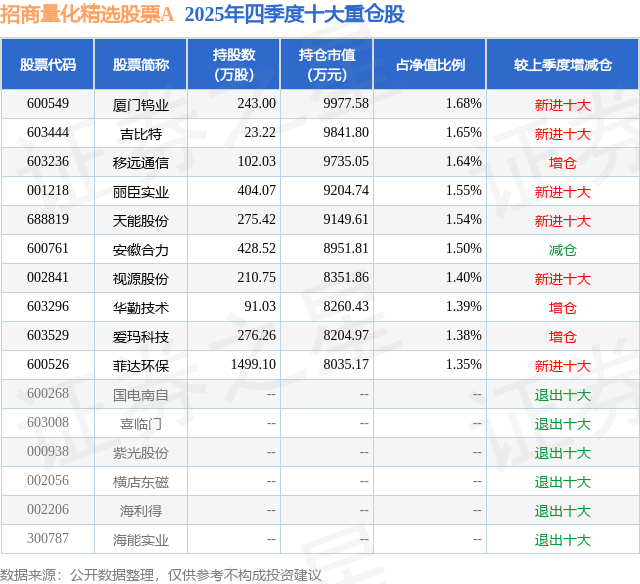 依据2025基金年报公募基金重仓股数据,重仓该股的公募基金共3家,其间持有数量最多的公募基金为招商基金的招商量化精选股票A。招商量化精选股票A现在规划为36.92亿元,最新净值3.5739(3月20日),较上一交易日跌落1.57%,近一年上涨24.1%。该公募基金现任基金司理为王平。王平在任的基金产品有:招商沪深300指数增强A,办理时刻为2017年2月10日至今,期间收益率是76.89%;招商中证盈利ETF,办理时刻为2019年11月28日至今,期间收益率是112.28%;招商中证光伏工业指数A,办理时刻为2021年6月18日至今,期间收益率是-19.96%。